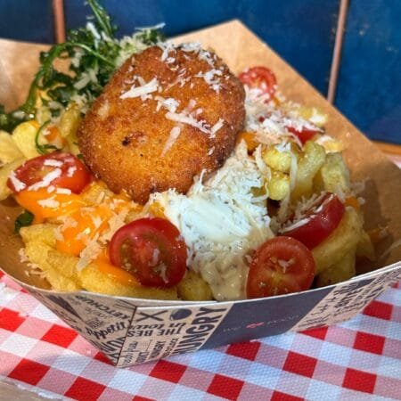 Frietjes met homemade gehaktballetjes in pittige saus, cheddarsaus, toppings.Toevoegen aan winkelwagen € 13,50 - Beoordeeld met 0 van 5